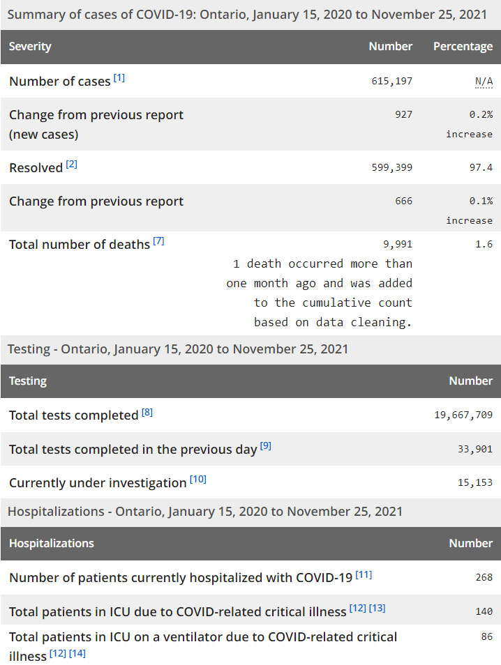 再看看安省方面的详细数据,截止11月25日,安省已对19,667,709例进行了新冠病毒检测(检测数较昨天新增33,901),还有15,153处于被调查阶段。确诊总数615,197(当天新增927;阳性率上升至2.73%),包括599,399例康复(康复率下降为97.4%)、9,991例死亡(增加6例,死亡率仍为1.6%)。住院患者268例(增加11例);进入ICU患者140例(增加3);IU插呼吸机患者86(减少1)。