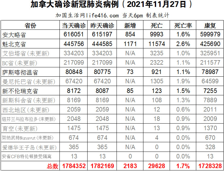 【加国生活网编译报道】截至2021年11月27日下午6点,加拿大新冠确诊病例总数为1784352(新增2183),死亡29628(新增10)。安省确诊总数616051(新增854);魁省确诊总数445756(新增1171);萨省确诊总数80848(新增73);新不伦瑞克省确诊总数8172(新增85);其余省份逢周末不更新。加拿大公共卫生局已更新口罩指南,虽然非医用口罩可以帮助防止新冠病毒的传播,但医用口罩和呼吸器可以提供更好的保护,因为越来越多的证据表明新冠病毒传播不仅仅是通过呼吸道飞沫传播,还通过气溶胶传播。加国生活网专门制作了如下统计数据表: