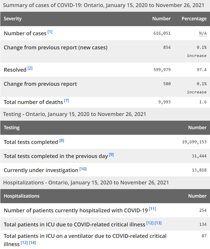 再看看安省方面的详细数据,截止11月26日,安省已对19,699,153例进行了新冠病毒检测(检测数较昨天新增31,444),还有13,818处于被调查阶段。确诊总数616,051(当天新增854;阳性率下降至2.72%),包括599,979例康复(康复率仍为97.4%)、9,993例死亡(增加2例,死亡率仍为1.6%)。住院患者254例(减少14例);进入ICU患者134例(减少6);IU插呼吸机患者87(增加1)。
