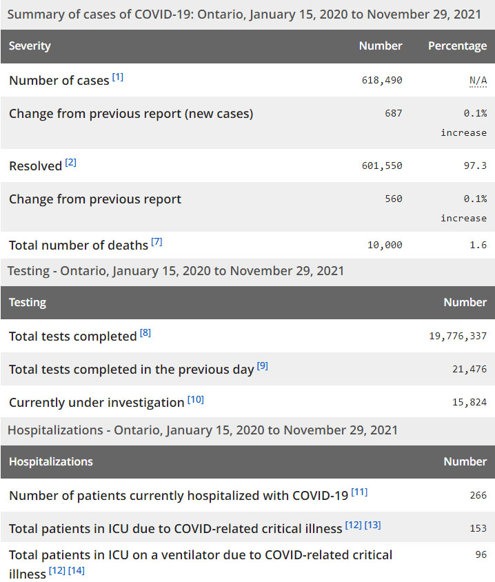 再看看安省方面的详细数据,截止11月29日,安省已对19,776,337例进行了新冠病毒检测(检测数较昨天新增21,476),还有15,824处于被调查阶段。确诊总数618,490(当天新增687;阳性率上升至3.20%),包括601,550例康复(康复率仍为97.3%)、10,000例死亡(增加3例,死亡率仍为1.6%)。住院患者266例(增加121例);进入ICU患者153例(增加5);IU插呼吸机患者96(增加7)。