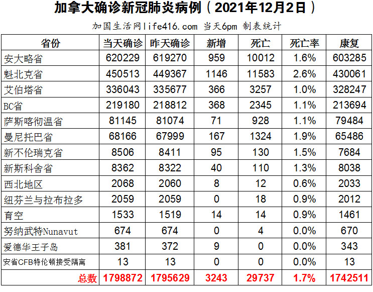 【加国生活网编译报道】截至2021年12月2日下午6点,加拿大新冠确诊病例总数为1798872(新增3234),死亡29737(新增23)。安省确诊总数620229(新增959);魁省确诊总数450513(新增1146);艾省确诊总数336043(新增366);BC省确诊总数219180(新增368);萨省确诊总数81145(新增71);曼省确诊总数68166(新增167)。安省新增959例确诊病例,7天的日均病例数攀升至851例,创自6月5日以来最高点,突破性感染占45%;安省正式宣布从12月13日上午8点起,50岁及以上省民可预约加强剂疫苗。加国生活网专门制作了如下统计数据表: