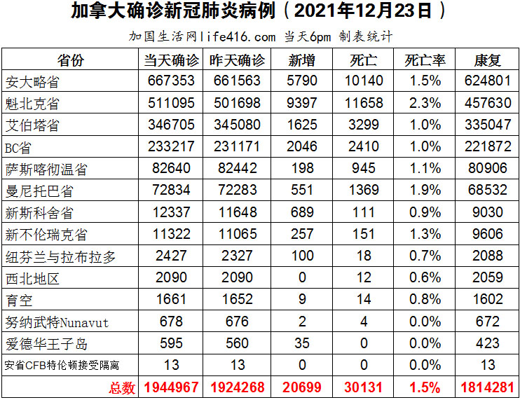 【加国生活网编译报道】截至2021年12月23日下午6点,加拿大新冠确诊病例总数为1944967(新增20699),死亡30131(新增18)。安省确诊总数667353(新增5790);魁省确诊总数511095(新增9397);艾省确诊总数346705(新增1625);BC省确诊总数233217(新增2046);萨省确诊总数82640(新增198);曼省确诊总数72834(新增551);新斯科舍省确诊总数12337(新增689)。加拿大在12月23日新增20699例确诊病例,不仅四创自疫情以来的最高纪录,而且还是首次突破2万例大关;根据两项最新的英国研究显示,Omicron可能比Delta更温和;安省新增5,790例确诊病例,首创自疫情以来的最高纪录。加国生活网专门制作了如下统计数据表: