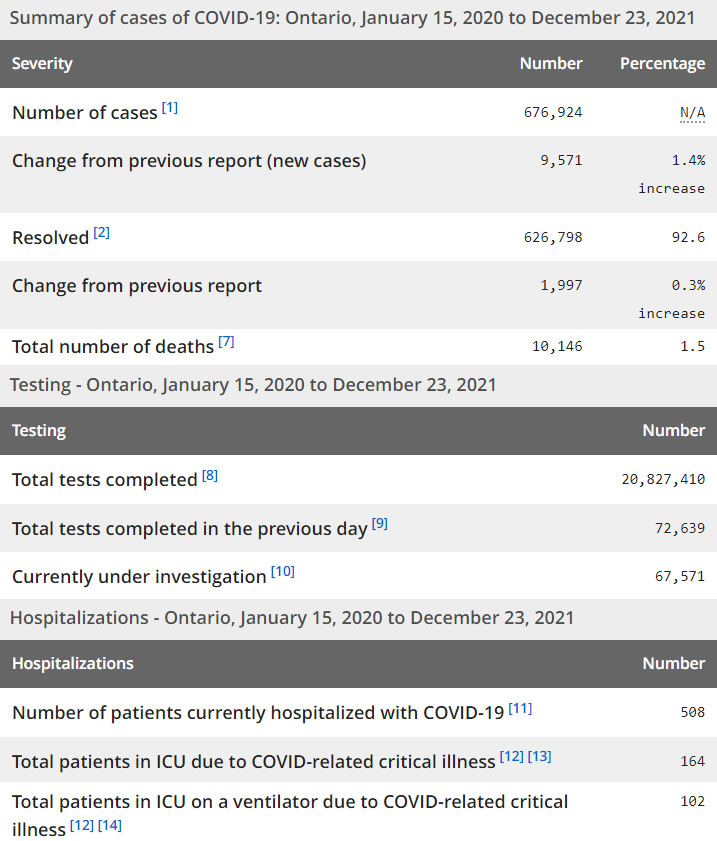 再看看安省方面的详细数据,截止12月23日,安省已对20,827,410例进行了新冠病毒检测(检测数较昨天新增72,639),还有67,571处于被调查阶段。确诊总数676,924(当天新增9,571;阳性率上升至13.18%),包括626,798例康复(康复率下降为92.6%)、10,146例死亡(增加6例,死亡率仍为1.5%)。住院患者508例(增加68);进入ICU患者164例(减少5);IU插呼吸机患者102(减少4)。另:多伦多各个社区的疫情地图请点击这里。