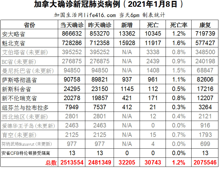 【加国生活网编译报道】截至2022年1月8日下午6点,加拿大新冠确诊病例总数为2513554(新增32205),死亡30743(新增75)。安省确诊总数866632(新增13362);魁省确诊总数728286(新增15928);萨省确诊总数90758(新增937);新斯科舍省确诊总数24295(新增1145);新不伦瑞克省确诊总数20278(新增421);纽芬兰与拉布拉多省确诊总数7949(新增412);其余省份逢周末没有更新数据。加拿大首席公共卫生官敦促近700万尚未接种疫苗的加拿大人赶紧接种疫苗;安省和魁省的死亡、住院和重症监护病例都在上升;安省政府又要为居民免费发放快速检测盒了;南非omicron疫情快结束了,住院人数已降到前几波记录的一半,每周超额死亡人数已不到峰值的五分之一。加国生活网专门制作了如下统计数据表: