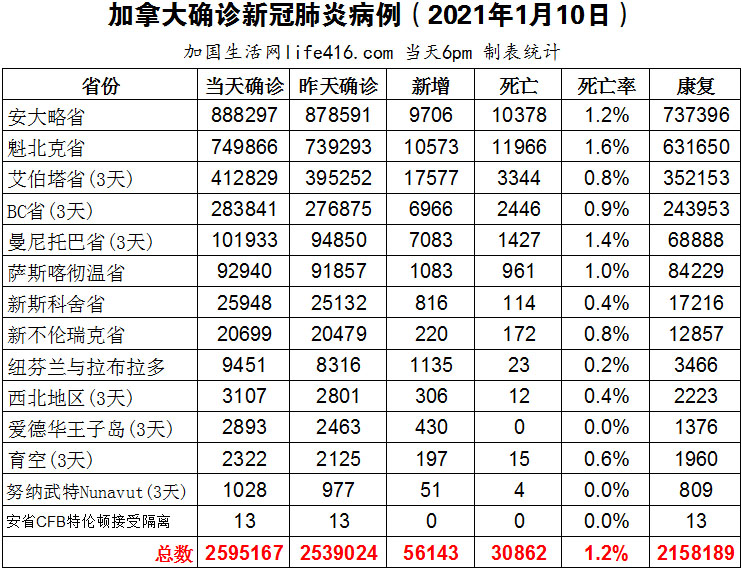 【加国生活网编译报道】截至2022年1月10日下午6点,加拿大新冠确诊病例总数为2595167(3天新增56143,当天新增36627),死亡30862(新增74)。安省确诊总数888297(新增9706);魁省确诊总数749866(新增10573);艾省确诊总数412829(3天新增17577,当天新增5281);BC省确诊总数283841(3天新增6966,当天新增2106);曼省确诊总数101933(3天新增7083,当天新增2106);萨省确诊总数92940(新增1083);新斯科舍省确诊总数25948(新增816);新不伦瑞克省确诊总数20699(新增220);纽芬兰与拉布拉多省确诊总数9451(新增1135)。虽然加拿大多个省份的住院和重症监护患者仍在激增,但每日新增确诊病例数在不断创纪录后,貌似迎来了拐点。加国生活网专门制作了如下统计数据表: