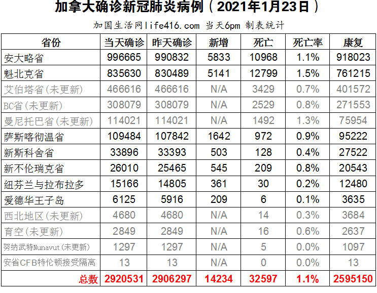 【加国生活网编译报道】截至2022年1月23日下午6点,加拿大新冠确诊病例总数为2920531(新增14234),死亡32597(新增92)。安省确诊总数996665(新增5833);魁省确诊总数835630(新增5141);萨省确诊总数109484(新增1642);新斯科舍省确诊总数33896(新增503);新不伦瑞克省确诊总数26010(新增545);纽芬兰与拉布拉多省确诊总数15166(新增361);爱德华王子岛确诊总数6125(新增209);其余省份逢周末没有更新。BC省新冠战略越发让人看不懂了,由于住院人数创历史新高,新冠阳性确诊患者与阴性完全疫苗接种者安置在同一个房间里;住院人数下降后,魁省大多数商店在周日重新开门营业。加国生活网专门制作了如下统计数据表: