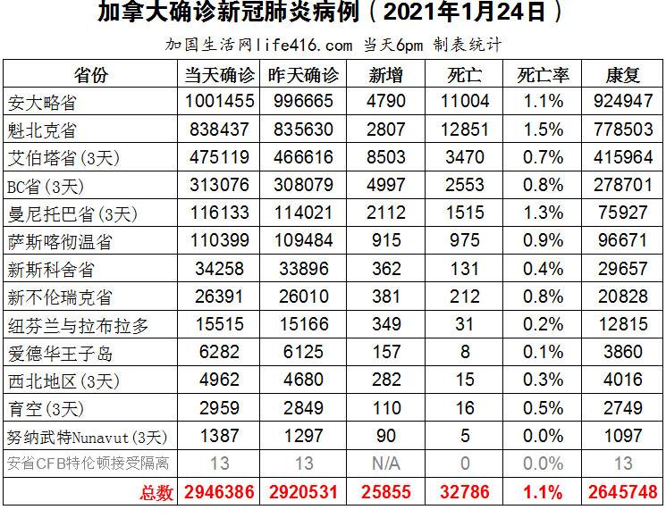 【加国生活网编译报道】截至2022年1月24日下午6点,加拿大新冠确诊病例总数为2946386(3天新增25855,当天新增13926),死亡32786(3天新增189)。安省确诊总数1001455(新增4790);魁省确诊总数838437(新增2807);艾省确诊总数475119(3天新增8503,当天新增1801);BC省确诊总数313076(3天新增4997,当天新增1345);曼省确诊总数116133(3天新增2112,当天新增536);萨省确诊总数110399(新增915)。安省新冠确诊病例总数正式突破了100万“里程碑”,官方死亡总数达到11,004例;安省在1月17日学生恢复面对面学习后,有100多所学校报告的教职员工和学生缺勤率超过50%;魁省计划加大力度覆盖尚未接种疫苗的省民,进入大型零售店需要提供疫苗证明。加国生活网专门制作了如下统计数据表: