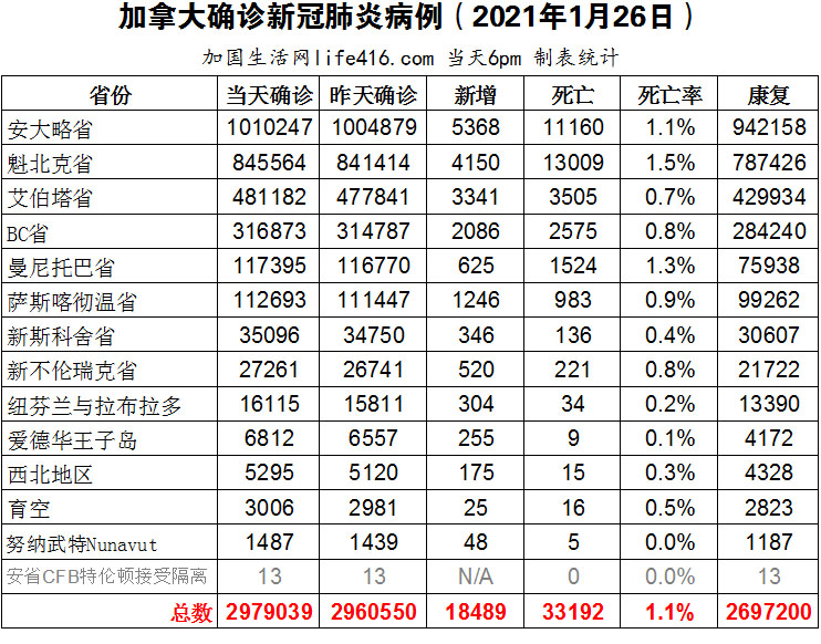 【加国生活网编译报道】截至2022年1月26日下午6点,加拿大新冠确诊病例总数为2979039(新增18489),死亡33192(新增227)。安省确诊总数1010247(新增5368);魁省确诊总数845564(新增4150);艾省确诊总数481182(新增3341);BC省确诊总数316873(新增2086);曼省确诊总数117395(新增625);萨省确诊总数112693(新增1246)。正当许多国家认为由Omicron所引发的“第五波”疫情高峰已过之际,与原始新冠病毒截然不同的Omicron变异病毒也变异了,被称为“Omicron妹妹BA.2”的Omicron亚变种日前已经在欧洲多国再次引发确诊病例的激增!由于BA.2无法使用核酸检测只能用基因检测,耗时耗力耗财,无法大面积开展,BC省才宣布放弃朔源,让省民自觉自测。加国生活网专门制作了如下统计数据表: