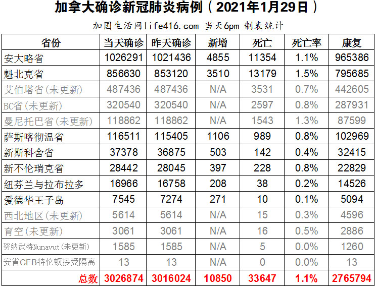 1月25日:加拿大宣布首例新冠病例整二年 共增近300万确诊病例以及3.3万死亡病例
