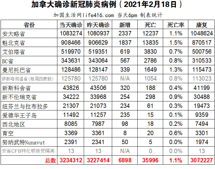 【加国生活网编译报道】截至2022年2月18日下午6点,加拿大新冠确诊病例总数为3234312(新增6898),死亡35996(新增73)。安省确诊总数1083274(新增2337);魁省确诊总数908466(新增1837);艾省确诊总数519970(新增619);BC省确诊总数343631(新增567);曼省确诊总数128486(新增339)。加拿大首席卫生官警告称新冠病毒仍在高水平传播,医院仍然捉襟见肘。人们应该继续采取预防措施,包括避开拥挤的地方,必要时一定要戴上口罩,过快放松公共卫生措施可能会导致疫情死灰复燃。加国生活网专门制作了如下统计数据表: