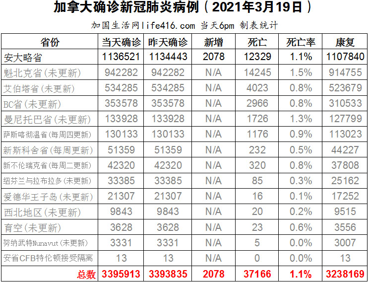 【加国生活网编译报道】截至2022年3月19日下午6点,加拿大新冠确诊病例总数为3395913(新增2078),死亡37166(增加16)。安省确诊总数1136521(新增2078);其余省份均未更新数据。加拿大首席卫生官Theresa Tam博士在3月18日表示,联邦政府正在积极审查其所有疫苗授权政策,以期结束一些人强制接种新冠疫苗的规定。她在新闻发布会上表示,加拿大公共卫生部正处于“非常重要的时刻”,新冠卫生政策可能很快就会从“强调要求”转向“建议”。加国生活网专门制作了如下统计数据表: