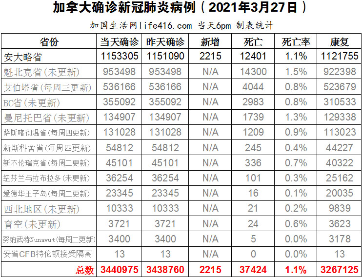 【加国生活网编译报道】截至2022年3月27日下午6点,加拿大新冠确诊病例总数为3440975(新增2215),死亡37424(新增4)。安省确诊总数1153305(新增2215);其余省份均没有更新数据。魁省首席卫生官表示,最近几周由Omicron亚变体BA.2所驱动的病例激增,所有迹象都表明“第六波”疫情正向魁省袭来,医疗卫生系统受到了打击,在不到一周的时间里,有8,600名医护人员因新冠缺勤,缺勤人数增加了60%;不仅仅是魁省,连安省也出现医疗卫生系统医务人员感染率急剧上升的情况;全球新冠病例连续第二周增长,一周新增病例超过了1200万例,英国和以色列均疫情反弹。加国生活网专门制作了如下统计数据表: