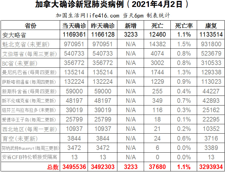 【加国生活网编译报道】截至2022年4月2日下午6点,加拿大新冠确诊病例总数为3495536(新增3233),死亡37680(新增9)。安省确诊总数1169361(新增3233);其余省份均没有更新数据。安省在4月2日新增3233例确诊病例和9例死亡病例。目前医院共有855例住院患者,创一个月来住院人数最多的一天;自2月9日以来,安省已经是连续第三天每日新增病例超过3千例。安省的废水数据也显示,目前每天确诊病例在3万至3.5万例。加国生活网专门制作了如下统计数据表: