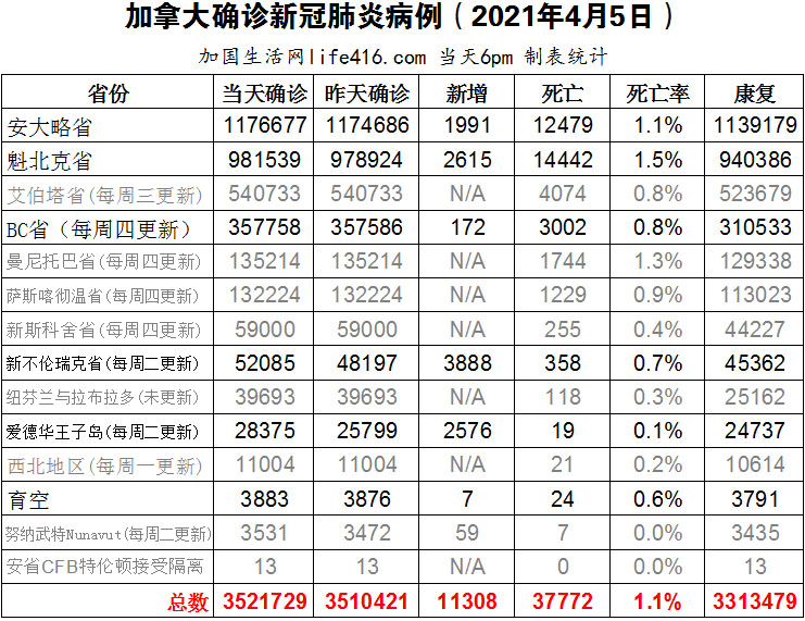 【加国生活网编译报道】截至2022年4月5日下午6点,加拿大新冠确诊病例总数为3521729(新增11308),死亡37772(新增51)。安省确诊总数1176677(新增1991);魁省确诊总数981539(新增2615);BC省确诊总数357758(新增172,很快变成每周四更新);新不伦瑞克省确诊总数52085(一周新增3888);爱德华王子岛确诊总数28375(一周新增2576)。加拿大国家免疫咨询委员会(NACI)强烈建议为社区中 80 岁及以上的老年人、长期护理和其他聚集环境中的老年人“快速部署”第四剂疫苗,同时各地区也可能考虑向居住在社区的70 至79岁的成年人提供第四剂疫苗;安省卫生部长宣布60 岁或以上的省民将很快能够接种第四剂疫苗。加国生活网专门制作了如下统计数据表: