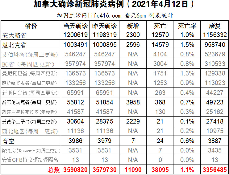 【加国生活网编译报道】截至2022年4月12日下午6点,加拿大新冠确诊病例总数为3590820(新增11090),死亡38095(新增51)。安省确诊总数1200619(新增2300);魁省确诊总数1003491(新增2596);新不伦瑞克省确诊总数55812(一周新增3958);爱德华王子岛确诊总数30604(一周新增2229)。加拿大国家免疫咨询委员会强烈建议所有成年人和12至17岁免疫功能低下的儿童接种加强剂疫苗(第三剂疫苗),因为加拿大正在经历“第六波”疫情。加国生活网专门制作了如下统计数据表: