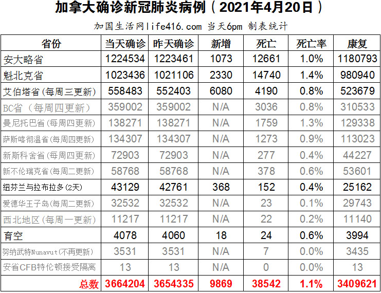 【加国生活网编译报道】截至2022年4月20日下午6点,加拿大新冠确诊病例总数为3664204(新增9869),死亡38542(新增113)。安省确诊总数1224534(新增1073);魁省确诊总数1023436(新增2330);艾省确诊总数558483(一周新增6080)。安省医院住院患者攀升至1,662例,创安省第六波疫情的最高纪录;安省当天还新增28例死亡病例,创两周以来单日最高的死亡人数。由于安省的PCR检测受限制,安省新冠科学咨询组负责人Peter Juni博士认为将每天报告的新增病例数乘以20倍才能反映实际感染情况。加国生活网专门制作了如下统计数据表: