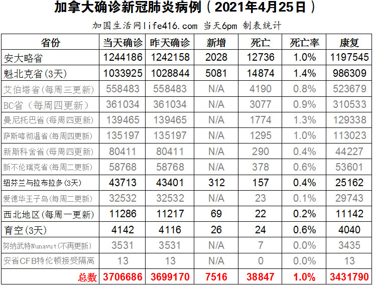 周末终于结束了,停止更新的一些省份也都终于更新数据了,加国生活网小编将3天新增的7516(上周末3天新增17138)进行了分解。随着Omicron亚变体BA.2在加拿大在社区内传播,“第六波”疫情正在加拿大爆发。加国生活网小编专门统计了从2021年4月26日至2022年4月25日的二个省份的新增确诊数,并制作了如下曲线图,让大家能一目了然地了解加拿大新冠疫情的发展趋势。加拿大当日新增3453例,按新增确诊数由多至少的排列分别是:安省新增2028、魁省新增1305。