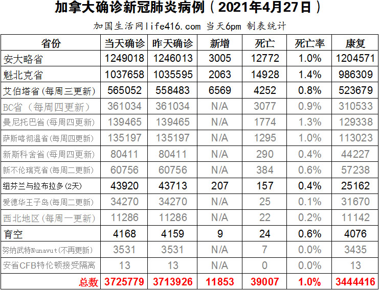 【加国生活网编译报道】截至2022年4月27日下午6点,加拿大新冠确诊病例总数为3725779(新增11853),死亡39007(新增106)。安省确诊总数1249018(新增3005);魁省确诊总数1037658(新增2063);艾省确诊总数565052(一周新增6569)。美国制药巨头Moderna公司选择加拿大魁省大蒙特利尔地区来建造其新的生物制造工厂;一些临床医生报告称,最近几周出现胃肠道症状的新冠患者激增,但医学专家则认为,该症状是否是由Omicron或亚变体BA.2所引发还没有确切证据。加国生活网专门制作了如下统计数据表: