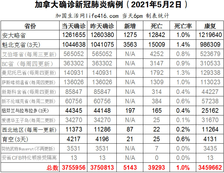 【加国生活网编译报道】截至2022年5月2日下午6点,加拿大新冠确诊病例总数为3755956(3天新增5143,当天新增2284),死亡39293(新增33)。安省确诊总数1261655(新增1275);魁省确诊总数1044638(3天新增3563,当天新增906)。随着加拿大各省和地区将新冠卫生限制措施放宽,加拿大总理特鲁多在上周四新闻发布会上被问到是否考虑会在5月中旬取消公共场所的口罩强制令,快看总理回应;加拿大卫生部的数据显示18至29岁年龄组第三剂疫苗接种率仅35%,明显落后于其他年龄组。加国生活网专门制作了如下统计数据表: