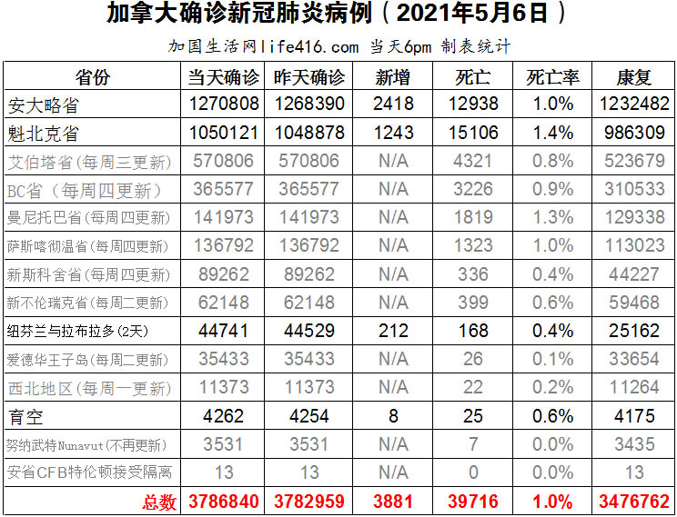 【加国生活网编译报道】截至2022年5月6日下午6点,加拿大新冠确诊病例总数为3786840(新增3881),死亡39716(新增39)。安省确诊总数1270808(新增2418);魁省确诊总数1050121(新增1243)。加拿大公共卫生部PHAC和加拿大统计局最近发起了一项调查,以广泛了解人们在感染新冠病毒所受到的影响。加拿大首席卫生官Theresa Tam博士预计长期新冠的影响将相当大,只可惜PHAC对长期新冠(也称为新冠后状况)的影响知之甚少,包括如何诊断它。加国生活网专门制作了如下统计数据表:
