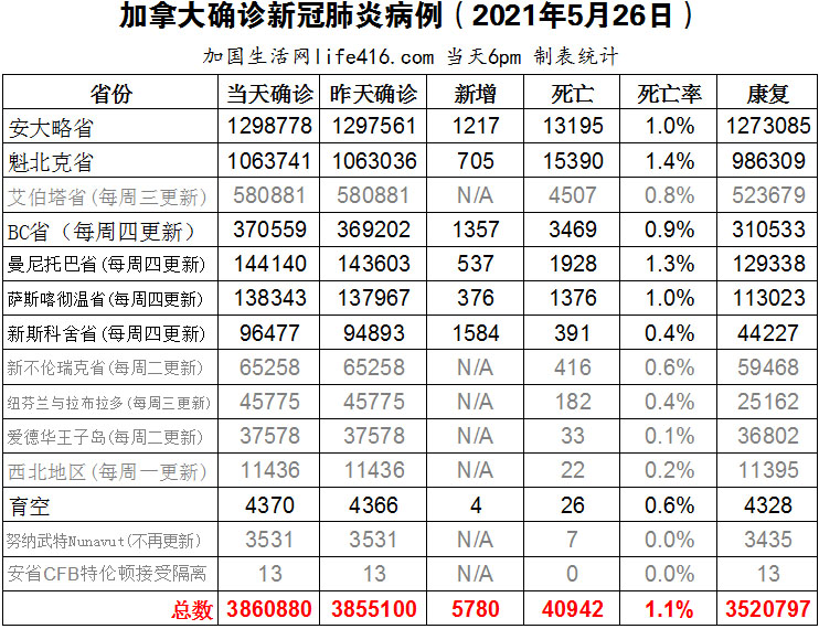 【加国生活网编译报道】截至2022年5月26日下午6点,加拿大新冠确诊病例总数为3860880(新增5780),死亡40942(新增143)。安省确诊总数1298778(新增1217);魁省确诊总数1063741(新增705);BC省确诊总数370559(一周新增1357);曼省确诊总数144140(一周新增537);萨省确诊总数138343(一周新增376);新斯科舍省确诊总数96477(一周新增1584)。多伦多公共卫生部表示,近日多伦多调查了几个疑似猴痘病例,最终在5月26日实验室检测结果确诊了首例猴痘病例。目前多伦多现在总共有1个高度疑似病例和4个疑似病例,这5例都在等待实验室检测结果的最终确认。加国生活网专门制作了如下统计数据表: