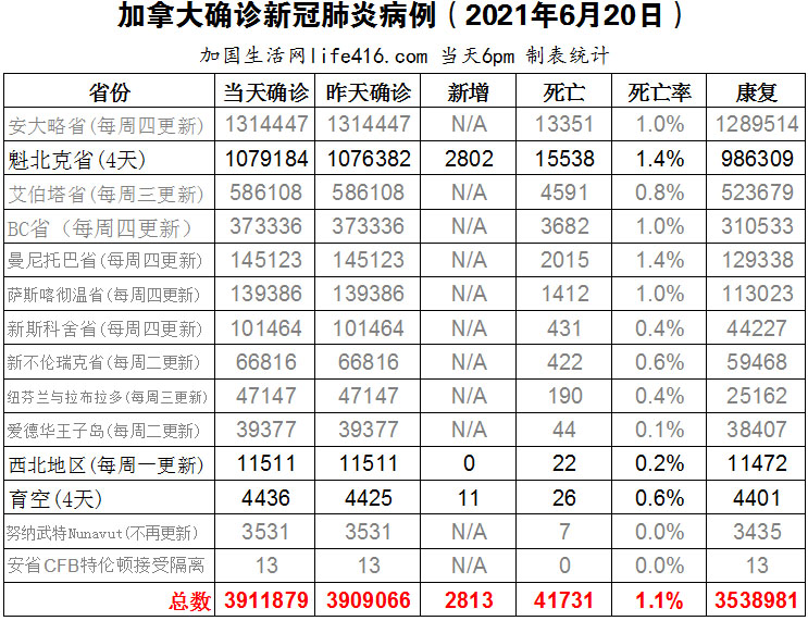 6月17日至6月19日加拿大各省没有疫情数据更新报道暂停