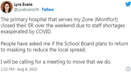 渥太华最大的教育局OCDSB则表示,将鼓励戴口罩,政府仍将为有需要的人提供快速抗原检测和口罩。但OCDSB受托人 Lyra Evans则呼吁召开董事会会议,重新审视戴口罩的决定。她说在Twitter上写道:“由于新冠病例激增导致医务人员短缺,我所在地区(Montfort)的医院在周末关闭了急诊室。人们问我,学校董事会是否计划恢复戴口罩以减少当地传播,我将呼吁召开一次会议来推动我们所做的事情。”