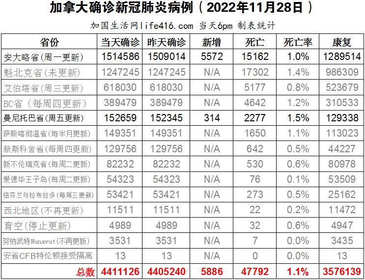 【加国生活网编译报道】截至2022年11月28日下午6点,加拿大新冠确诊病例总数为4411126(新增5886),死亡47792(新增125),安省确诊总数1514586(新增5572,死亡新增109)、曼省确诊总数152659(一周新增314,死亡新增16)。由于新冠疫情期间常规疫苗接种减少,麻疹、白喉等这种原本可以预防的高度传染性疾病可能会随着世界其他地方的传播而在加拿大迅速传播,儿科医生敦促父母确保他们的孩子得到充分的免疫接种。加国生活网专门制作了如下统计数据表: