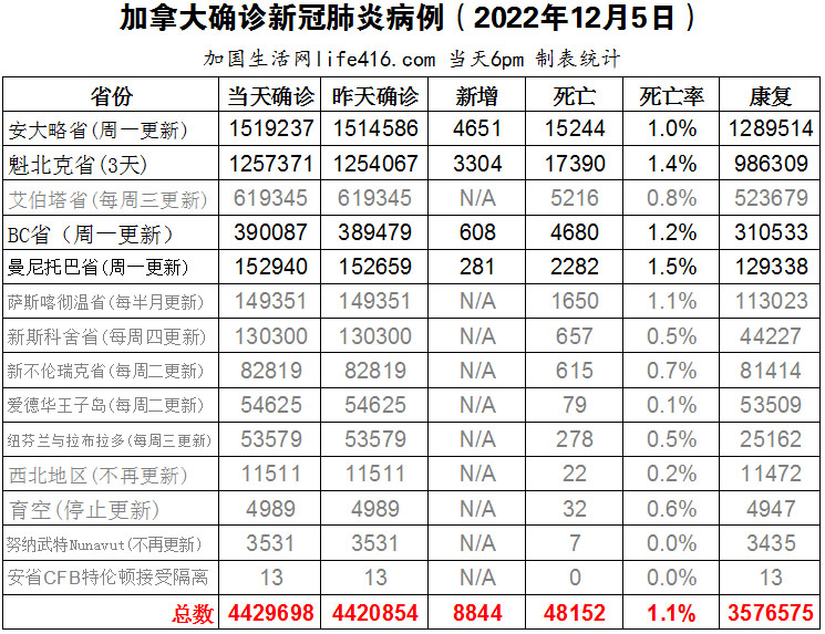 【加国生活网编译报道】截至2022年12月5日下午6点,加拿大新冠确诊病例总数为4429698(新增8844),死亡48152(新增154),安省确诊总数1519237(一周新增4651,死亡新增82);魁省确诊总数1257371(3天新增3304,死亡新增29);BC省确诊总数390087(一周新增608,死亡新增38);曼省确诊总数152940(一周新增281,死亡新增5)。加拿大各地正遭受新冠病毒、流感病毒和RSV病毒三重打击,全国医疗系统都面临着空前压力,特别是儿童医院的压力最大。加国生活网专门制作了如下统计数据表: