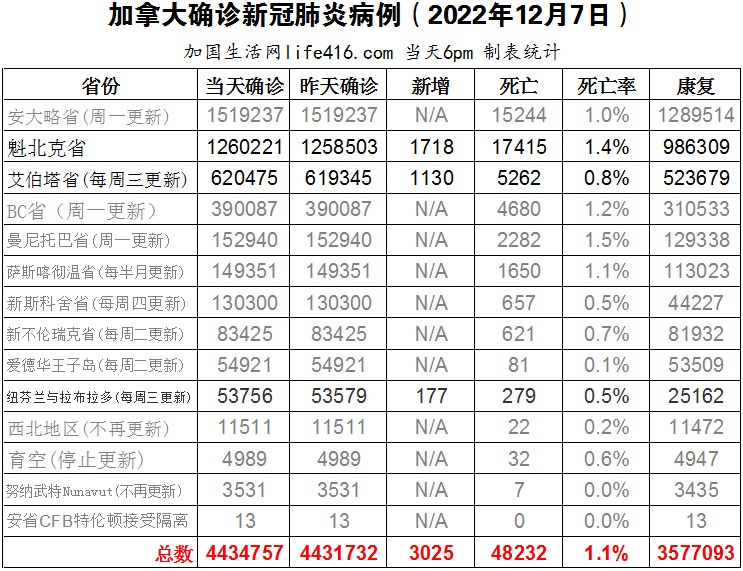 【加国生活网编译报道】截至2022年12月7日下午6点,加拿大新冠确诊病例总数为4434757(新增3025),死亡48232(新增53),魁省确诊总数1260221(新增1718,死亡新增6);艾省确诊总数620475(一周新增1130,死亡新增46);纽芬兰与拉布拉多确诊总数53756(一周新增177,死亡新增1)。一位儿科传染病专家警告称,流感病毒紧随RSV与新冠之后激增,流感季节提前开始,因流感而住院的儿童比平时多得多,急诊室不堪重负,这表明加拿大的医疗保健系统长期资金不足,已经影响到最脆弱的公民。加国生活网专门制作了如下统计数据表: