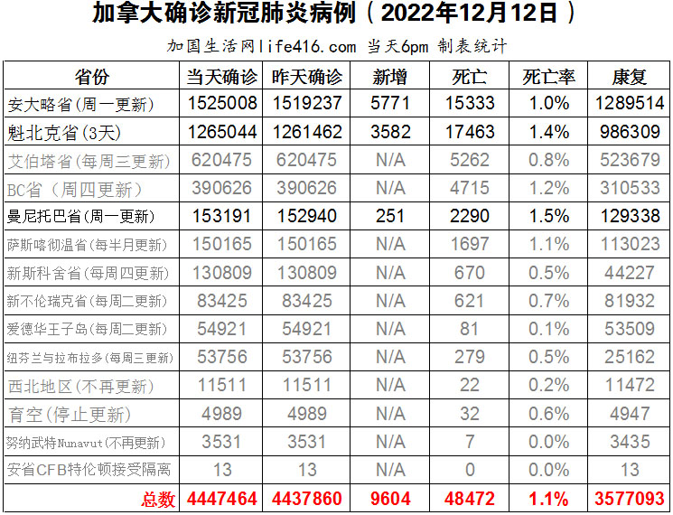 【加国生活网编译报道】截至2022年12月12日下午6点,加拿大新冠确诊病例总数为4447464(新增9604),死亡48472(新增134),安省确诊总数1525008(一周增5771,死亡新增89);魁省确诊总数1265044(3天新增3582,死亡新增37);曼省确诊总数153191(一周新增251,死亡新增8)。Omicron彻底改变了新冠“游戏规则”,一年前它出人意料地出现并在数周内迅速传播到世界各地,仅在2022年1月至8月期间,全世界至少有100万人死于Omicron及其亚变体,而且它接下来会做什么仍然存在很多不确定性。那么,人类准备好迎接下一步了?加国生活网专门制作了如下统计数据表: