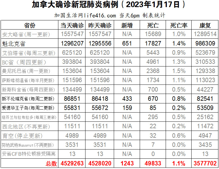 【加国生活网编译报道】截至2023年1月17日下午6点,加拿大新冠确诊病例总数为4529263(新增1243),死亡49833(新增29),魁省确诊总数1296207(新增651,死亡新增22);新不伦瑞克省确诊总数86851(一周新增433,死亡新增11);爱德华王子岛确诊总数55831(一周新增159,死亡新增2)。根据安省卫生部最新发布的数据显示,安省目前新增病例的22%是感染了Kraken,这意味着加拿大第九轮疫情已经开始,专家表示Kraken在加拿大传播模式会遵循美国最近几个月传播的类似模式。加国生活网专门制作了如下统计数据表: