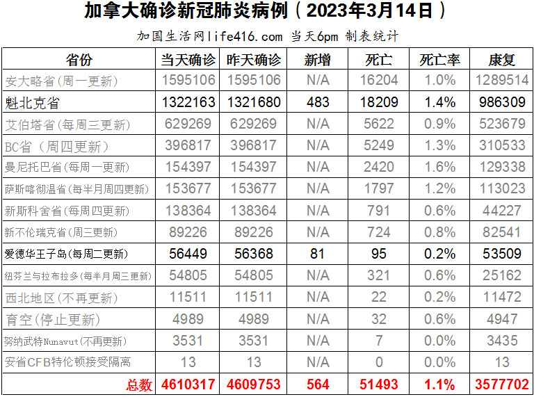 【加国生活网编译报道】截至2023年3月14日下午6点,加拿大新冠确诊病例总数为4610317(新增564),死亡51493(新增21),魁省确诊总数1322163(新增483,死亡新增19);爱德华王子岛确诊总数56449(一周新增81,死亡新增2)。回顾过去三年的新冠疫情,作为研究人们如何应对公共卫生政策的专家,蒙特利尔康考迪亚大学行为医学教授Simon Bacon十分担心。新冠病毒仍然存在,如果又出现一种新的、更具传染性、毒性更高变体,加拿大人都没有任何预防行为,加拿大将回到原点。加国生活网专门制作了如下统计数据表:
