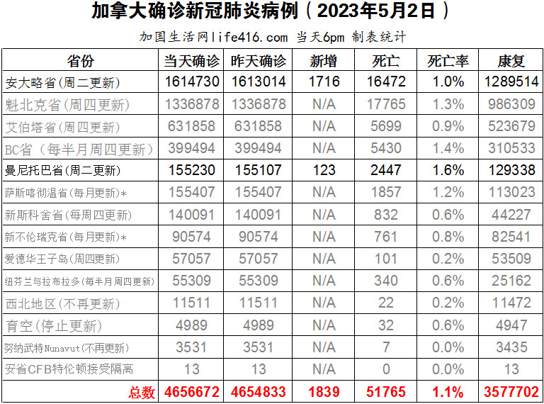 鉴于魁省改为每周更新数据和BC省5月4日停止更新数据,其他各省数据也是不稳定列新,加国生活网每日疫情报道从4月18日起改为每周一次或两次报道,根据各省的数据更新情况而定,请大家理解!