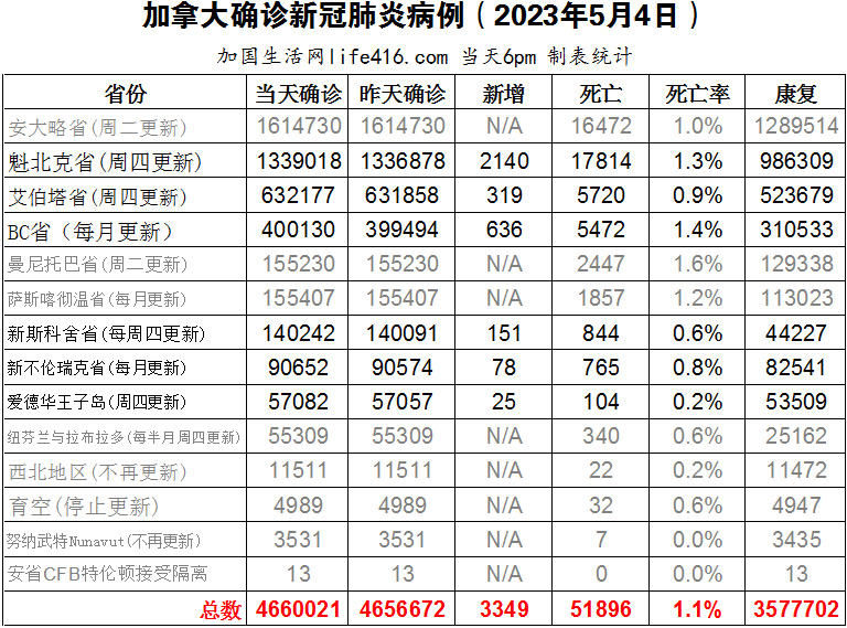 【加国生活网编译报道】截至2023年5月4日,加拿大新冠确诊病例总数为4660021(新增3349),死亡51896(新增131例),魁省确诊总数1339018(一周新增2140,死亡新增49);艾省确诊总数632177(一周新增319,死亡新增21);BC省确诊总数400130(二周新增636,死亡新增42)*;新斯科舍省确诊总数140242(一周新增151,死亡新增12);新不伦瑞克省确诊总数632177(一周新增78,死亡新增4);爱德华王子岛确诊总数57082(一周新增25,死亡新增3)。世界卫生组织在5月5日宣布,新冠疫情不再是全球紧急事件,但新冠病毒仍在传播,每周仍有数千例死亡病例。加国生活网专门制作了如下统计数据表: