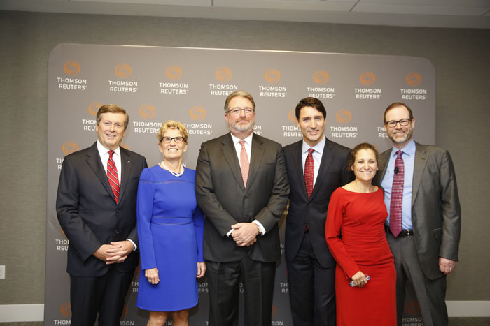 省长韦恩(左二)与汤森路透总裁兼首席执行长Jim Smith(右四)、总理杜鲁多(右三)及市长庄德利(左)合照。
