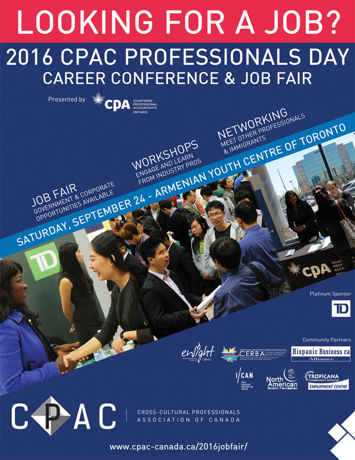 【加国生活网】加拿大中国专业人士协会(CPAC)于2016年9月8日宣布:旨在帮助海外背景的专业人士(ITPs)在职业及专业上得以发展的专业盛会,第十五届CPAC“专业人士日”暨招聘会将于9月24日在Armenian Youth Centre举行。CPAC“专业人士日”历经十五年的沉淀,已成为整个大多地区在帮助移民专业人士职业以及就业发展方面最大规模的活动之一,每年都吸引了逾千名专业人士的参加。