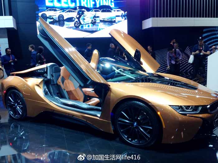 2019年BMW i8 Roadster敞篷跑车是该品牌混合动力超级跑车的首款版本(金色的哎,真漂亮)。与轿跑车一样,i8敞篷跑车采用1.5升三缸发动机与电动马达和9.4千瓦时锂离子电池相连。总功率输出额定功率为369马力,可以在4.6秒内将全轮驱动i8跑车从零开始提速至100公里/小时。i8跑车在其底盘和车身面板上广泛使用CFRP和铝。随着该款敞篷跑车在车展的推出意为着该款跑车将于春季发售。