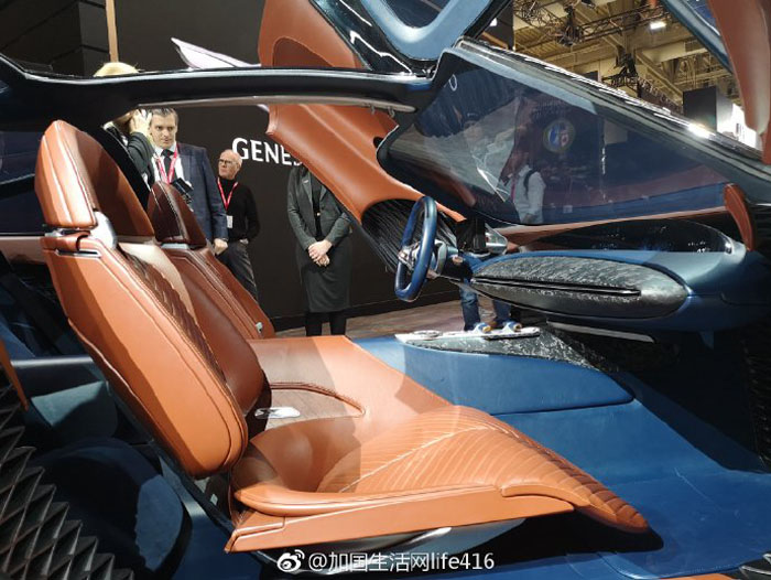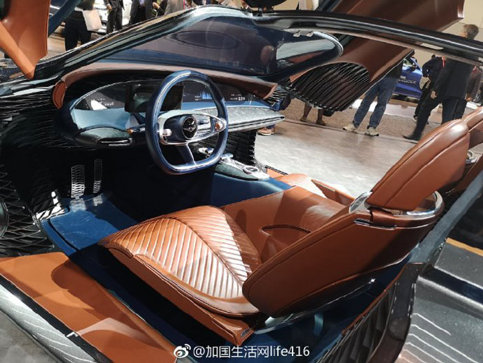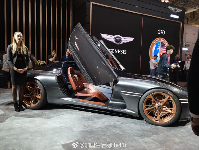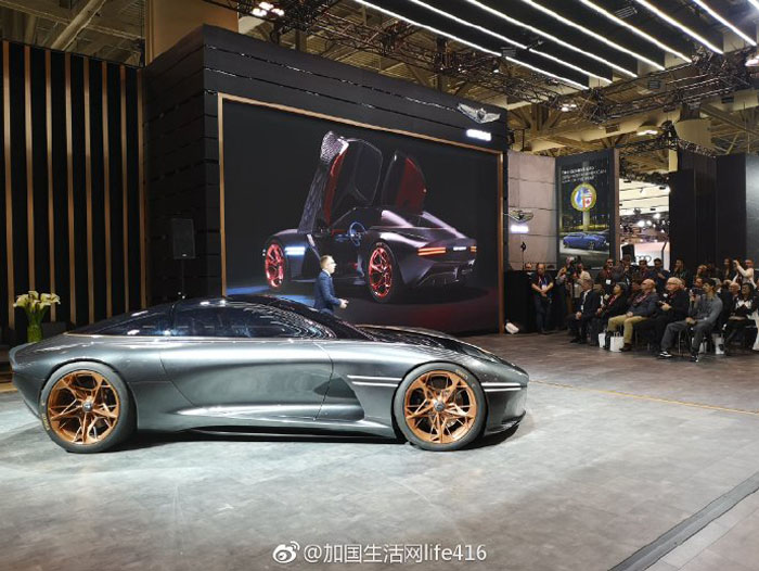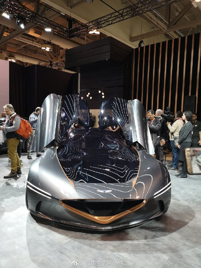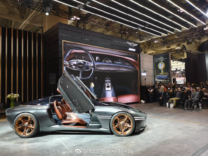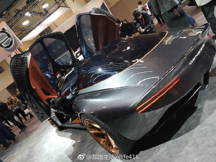 全电动、高性能的Genesis Essentia概念车是Genesis的首款电池电动跑车,拥有坚固的多电机电动动力系统,0-100km/h加速时间仅为3秒。车身由碳纤维材质打造,采用了星晨灰金属漆的涂装,整车线条流畅,大尺寸的进气口、出风口以及尾部的扩散器都更加符合空气动力学原理。该车还采用了指纹识别和面部识别的车门解锁方式,“蝴蝶门”的开启方式十分亮眼。