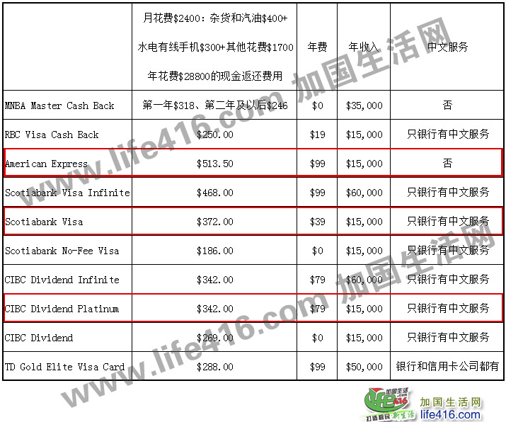 如果你不想付年费的话,可以选择CIBC Dividend Card,当然了现金返还额度一定是比付年费的少。至少是否选择付年费还是不是年费的信用卡,你就要根据你自己每月花费的情况来决定。每种卡的页面都有计算工具,让你根据每月花费计算所能得到的现金返还。