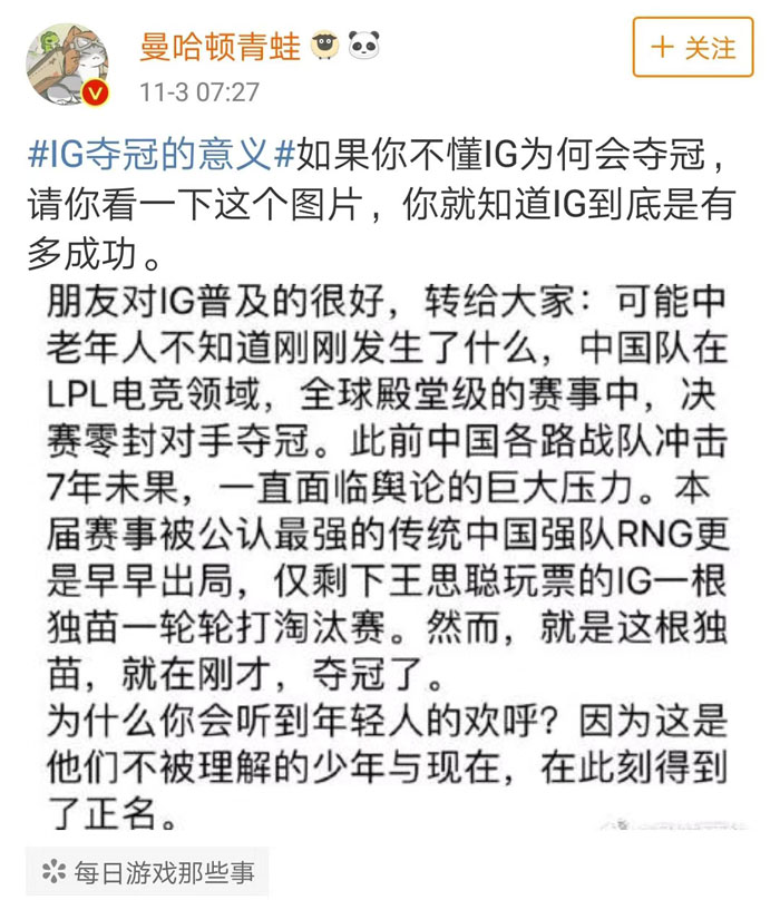 【加国生活网】2018年11月3日的微博被IG夺冠刷屏!相信好多朋友都在惊呼“IG是啥”?好吧,什么是代沟?代沟就是他们不知道谁是蓝洁瑛,我们不知道谁是IG!!