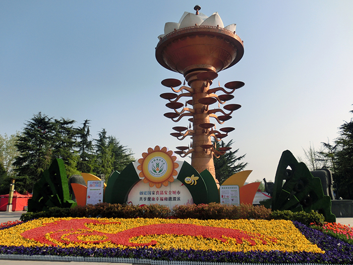 4月12日上午,我们(10位同学和家属)先来到宾馆附近的人民公园游览。走到公园门口,我被一块巨石上写有“周城”二字所迷惑,后来看旁边石碑文字说明才明白,周城的含义是以周代王城为原型,以周礼文化为核心,将宝鸡人民公园打造成融生态观光、文化传播、时尚体验为一体的“周礼文化主题公园”,再现周代礼治天下的盛世文明。这个主题公园北临滔滔渭水,南傍巍巍秦岭,占地600亩,以兴周湖为中心,有天下第一灯、周赋、周颂、乐府、奇石园等十大文化看点,融雕塑、音乐、舞蹈等艺术为一体,使盛世西周万千气象与宫廷风韵完美结合。尤其让人赞叹不已的是入园广场中心竖立着造型独特的“天下第一灯”。据说“天下第一灯”创意理念源于东周时期青铜树形灯,取意炎帝之火、青铜之光和金凤还巢。它采用不锈钢板整体锻造,总高度36.9米,总重量369吨。柱体有仿青铜纹饰雕刻,24盏灯采用物理发光仿真火焰技术。水池周围4只大象与荷花相映成趣,寓意祥和,金色凤凰展翅欲飞。