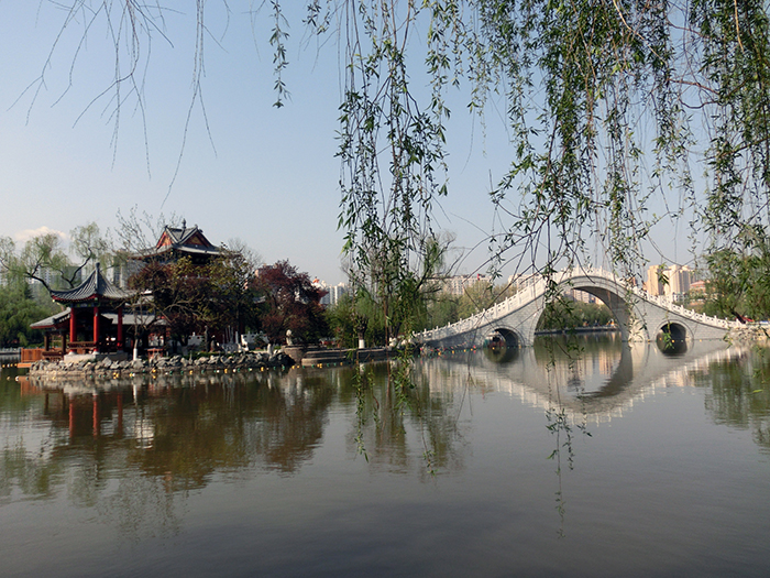 走入公园内,最让人赏心悦目是那汪宽阔的兴周湖,湖水清澈碧波荡漾,岸边杨柳枝条随风飘舞,绕湖小道逶迤曲折,道边郁金香色彩鲜艳,大有光临杭州西湖之感觉。真是美极了、妙极了,大家争先恐后在湖边、花前、石旁摄影留念,我带着一只小三角架,此时,发挥了拍摄集体照的作用,在这片迷人的环境中留下了难以忘怀的影像记忆。从公园出来,我们还顺道参观了公园门前的“民俗博物馆”,馆内展示的宝鸡地方特色浓郁的木版年画、剪纸、刺绣,草编工艺品、皮影社火脸谱等民俗风情,让我们这些外地人对宝鸡朴素而神秘的民间艺术大长见识、对宝鸡人民表现出的勤劳、聪明和智慧十分敬佩。