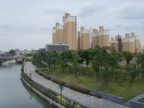 倚栏眺望,江面拓宽,江水流动快,水质变得十分清彻,已经没有了几年前污染发臭的景象。跨江的几座老桥已经拆除,翻修成拱形新石桥,显得有气派和特色。桥梯旁边立有石碑,上书有桥名和来历简介,象梧桐桥,马家桥,糖坊桥,都是儿时常来常往的地方,由于原来这些小桥为平跨江面,故几乎没有引桥坡面,如今的小桥高高拱起横跨江面,引桥踏梯分左右两侧,中间用二排粗粗的装饰镀铬钢管隔开,既当扶手又当装饰。登上桥顶观览左右和两岸风光,视线很是开阔。江南边新建筑的商业文化活动楼房与稍远处正在建造的住宅高楼群层叠呼应,映照在江里,构成一幅现代江南水乡的美景。