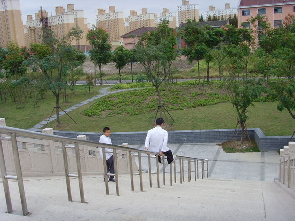 我在摄影时,一位七八岁的小女孩穿着旱冰鞋跌跌跄跄在凉亭周围练习,一对老年夫妇在她旁边照应,我用地道的浦东话与两位老者交谈,原来他们是小女孩的外公外婆,他们问我从哪里到此旅游的,我说是“自小离家老大回”的当地人,指着附近三林中学的教学大楼,告诉他们我就在这里念的中小学。我还提了一些老家人的姓名,他们大都认识,特别我提到然娘舅(见《崩瓜情谊》),居然还是那位老外公的同学。说熟悉了,谈话就没有顾忌,我问他们对三林古镇老街改造的看法,他们肯定镇政府改造工程消除了“脏乱差”,但没能象附近召家楼那样保持老街的原貌,让人看起来有点不伦不类。我嘴上没说什么,其实我也同意他们的看法,从当天节假日没有什么游客来就证明了这一点。