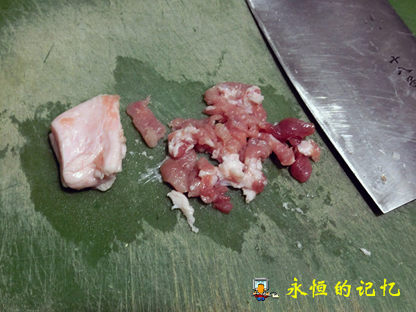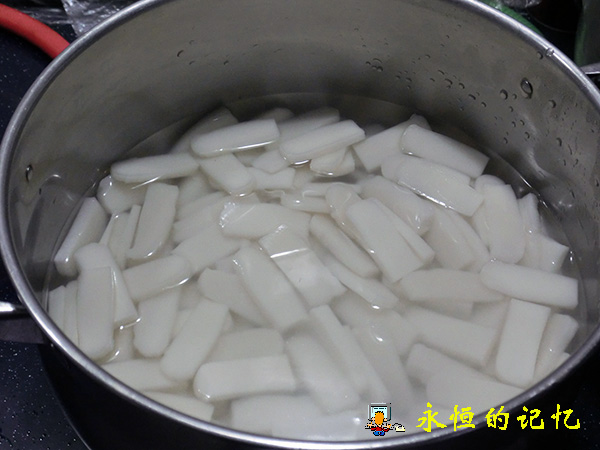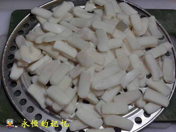 2、将长条原味年糕(选用纯糯米粉制成)切成片,其厚度大约5毫米,太厚不易熟,太薄则容易断,再将年糕片投放冷水中泡10分钟,以初步软化年糕外表干膜和清除不洁物。
