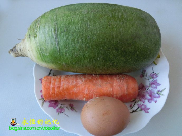 1、选色泽鲜亮、圆柱型的绿皮萝卜一个,胡萝卜一个(适量),鸡蛋一个。