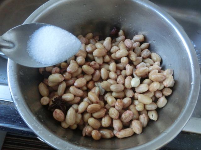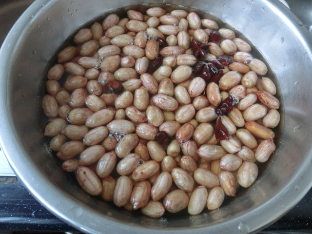 2、把500克花生米放入一只干净的容器中,挑出劣质颗粒,用净水加以清洗,控出清洗水后,加入大约50克食用细盐(小铝勺6勺),再倒入上述八角冷却水,用手指沾尝时,感觉挺咸即可。根据我的经验,生花生米内部不太容易入咸味。如花生自身较湿和粒胖,可泡发1.5小时;如较干和粒瘪,则泡发2小时。掌握标准是目测颗粒已初膨涨(不要膨涨过度),或用牙咬一颗,花生仁内已软即可。(见图1)