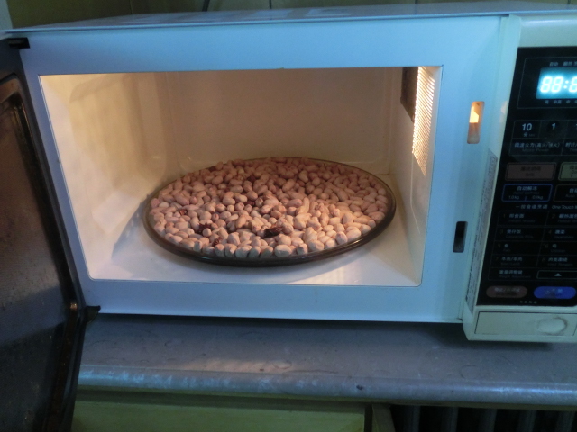 6、烘烤时间到,关闭微波炉,开启微波炉盖门,取几粒花生米放炉外,等其冷却后,手搓花生衣是否易掉?品尝花生仁是否香脆?如感觉仍未达到满意程度,再关闭炉门,继续加工1-2分钟,直至香脆为止。(见图6)