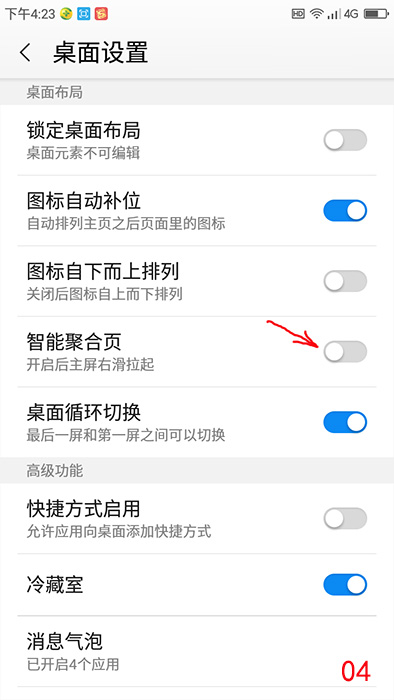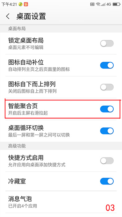 如果你的手机同样遇到类似问题,如果你也不喜欢这个“智能聚合页”,不妨试着用手指长按屏面,选择屏下“桌面设置”(图2),在展现的菜单中找到“智能聚合页”选项(图3),并加以关闭(图4),“立竿见影”即可解决。